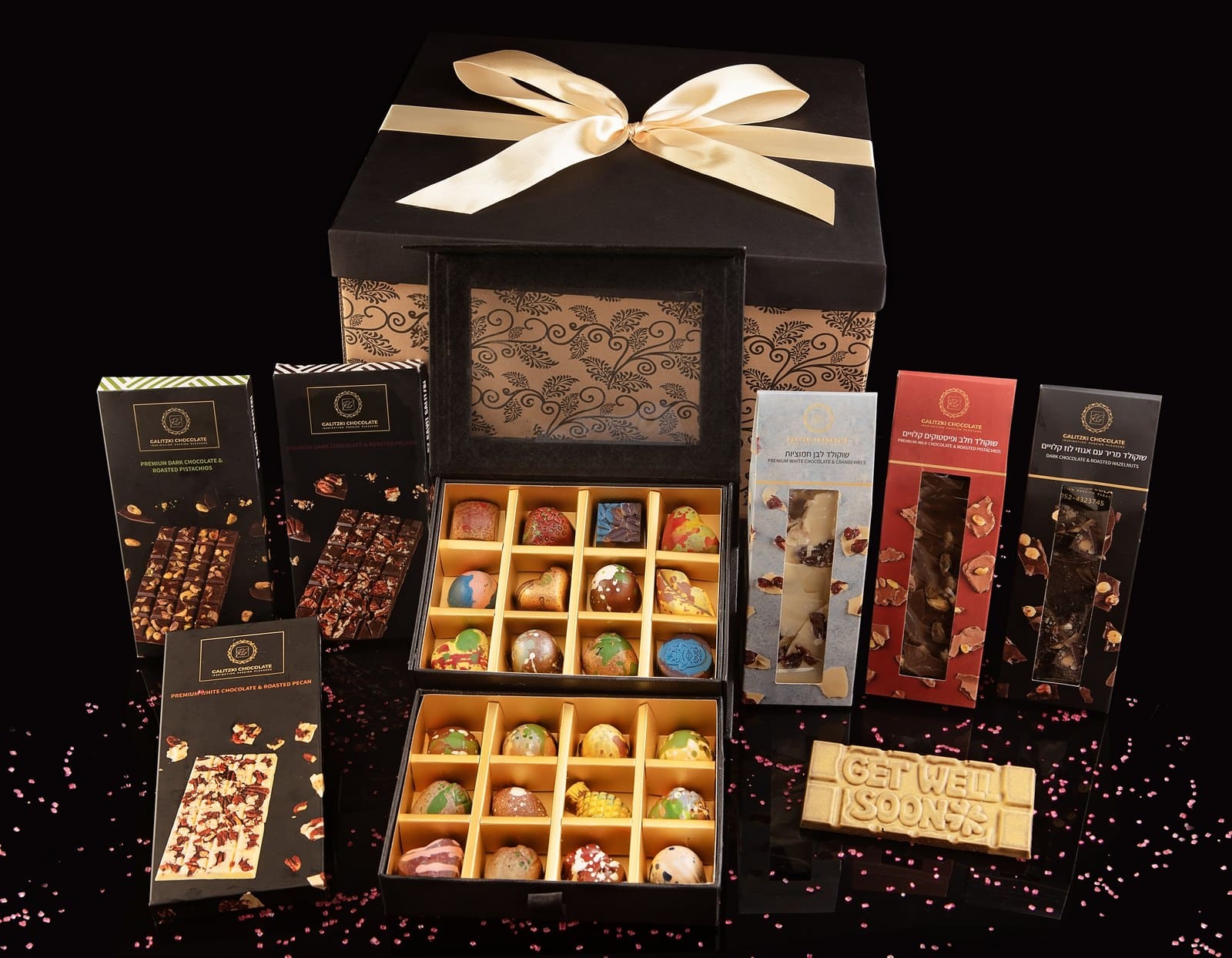 מארז 24 פרלינים של גליצקי 2 קומות יוקרתי עבודת יד בטעמים מיוחדים פירות בשמנת , גאנש שוקולד , ליקרים מיוחדים ועוד